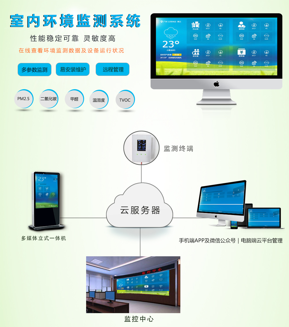 室內(nèi)專用環(huán)境檢 監(jiān)測系統(tǒng)終端是一款專門針對家居及公共場所室內(nèi)環(huán)境而定制全面24小時(shí)實(shí)時(shí)在線監(jiān)測的系統(tǒng),可以在手機(jī)端、電腦端遠(yuǎn)程查看相關(guān)監(jiān)測數(shù)據(jù)。
